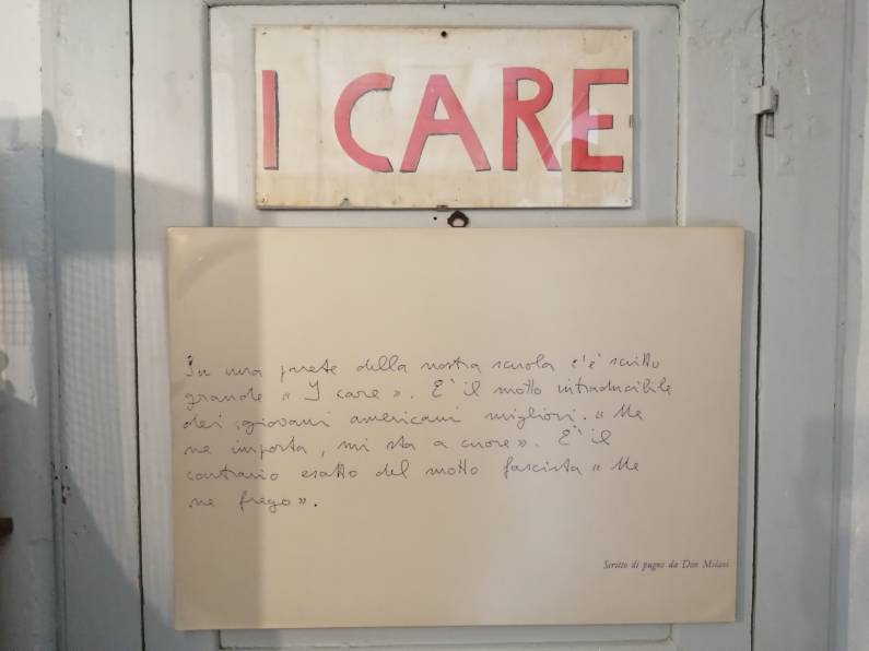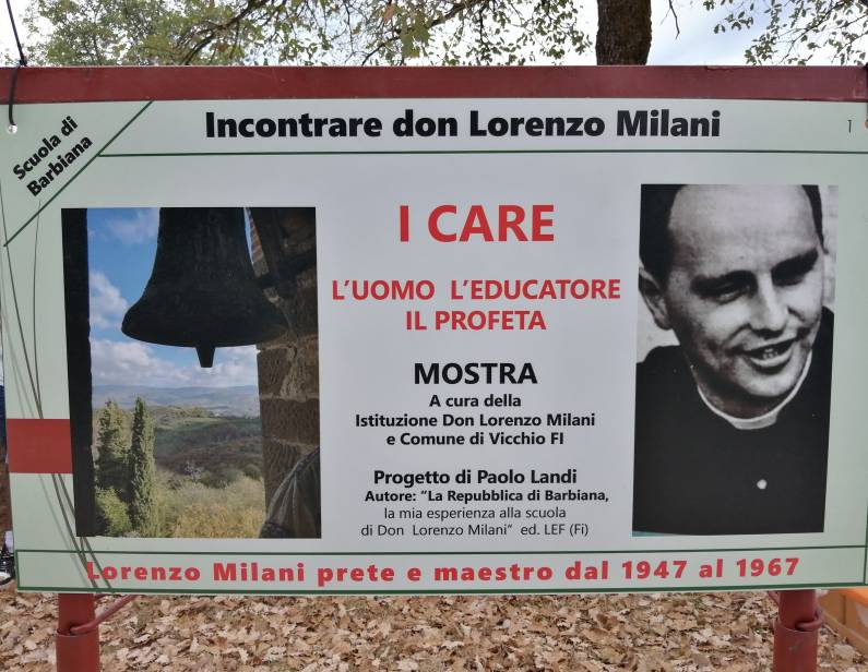 Intanto, ai giorni nostri si discute sull’introduzione della filosofia negli Istituti Tecnici. Nel dibattito fra pro e contro, interessante rilevare l’analogia con la situazione al tempo di don Milani, con l’Istituto Professionale a far oggi la parte che fu, allora, del Tecnico. Dice il dirigente Emanuele Contu, dell’Istituto Professionale “Puecher Olivetti” di Rho: «E poi, da dirigente di istituto professionale, mi sembra un po’ curiosa l’idea che la filosofia possa essere utile e buona per gli studenti del tecnico, ma non sia adatta per quelli del professionale; ho la sensazione ci sia dietro un pensiero inconsapevolmente mortificante nei confronti di chi sceglie questi percorsi formativi» (da: ilfattoquotidiano.it, 7 ottobre 2021). A provvisoria conclusione dei discorsi fin qui fatti “a partire da Barbiana”, anche questo piccolo spaccato di contemporaneità ci dà conferma di quanto i grandi temi della riflessione di don Milani, il prendersi cura e il dominio sulla parola, rimangano attuali, proprio come quel vecchio cartello appeso sulla porta e mai sbiadito: I CARE.